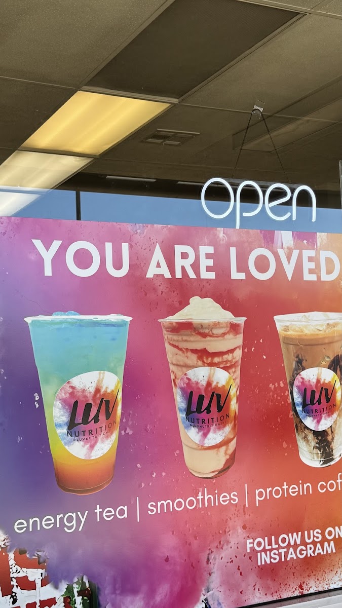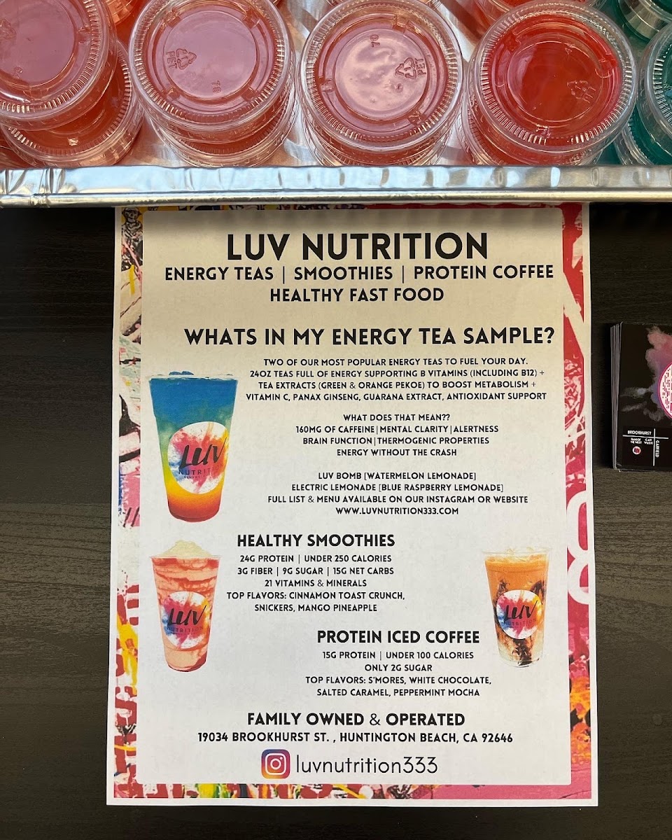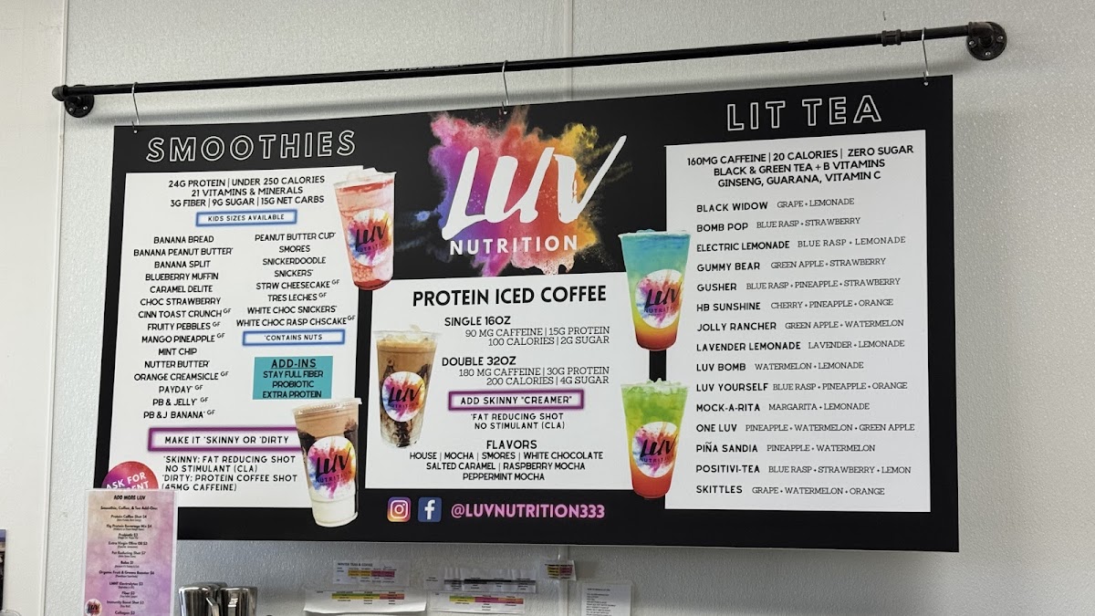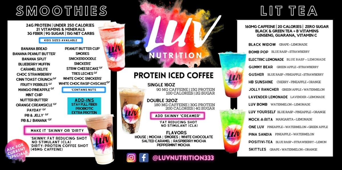 From a reviewer’s perspective, the menu at Luv Nutrition keeps things simple but fun, focusing on flavorful drinks rather than a large food selection. The smoothie lineup includes options like the Caramel Delite, which sounds like a sweet, dessert-inspired treat for those who enjoy richer flavors. Their Lit Tea selection is more extensive and creatively named, featuring drinks such as Black Widow, Bomb Pop, Electric Lemonade, Gummy Bear, and Gusher, each name suggesting bold, fruity, and energetic flavor profiles. Overall, the menu may be small, but the creative drink names and focus on specialty teas and smoothies make it appealing for customers looking for colorful, refreshing beverages rather than a full meal.